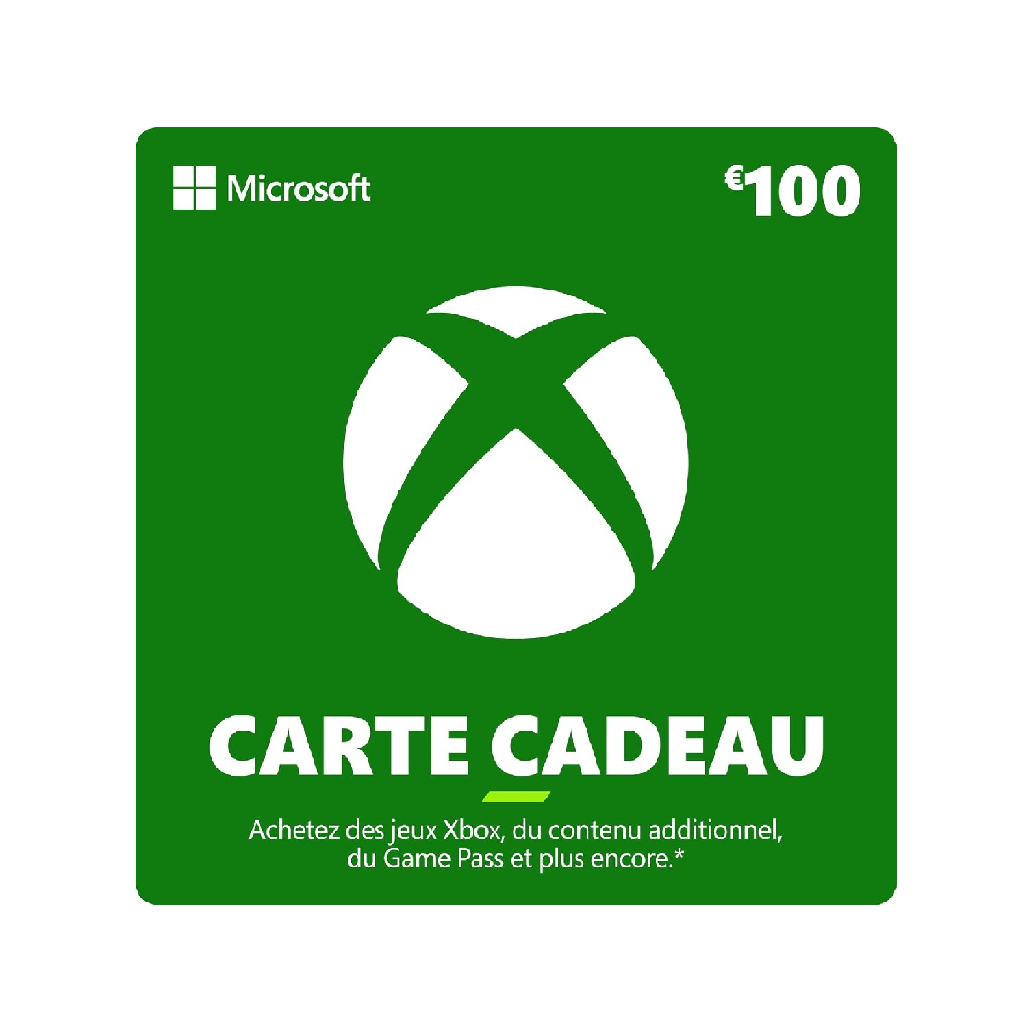 Achetez une carte-cadeau Xbox pour les jeux Xbox, les extensions, l’offre Game Pass, les manettes et plus encore sur consoles et PC Windows. Choisissez parmi des milliers de jeux, qu’il s’agisse des jeux favoris rétro compatibles ou des dernières versions digitales prêtes à l’emploi. Prolongez l’expérience de vos jeux préférés avec des extensions et de la monnaie virtuelle de jeu. Améliorez votre jeu avec une manette sans fil Xbox, ou jouez comme un pro avec une manette sans fil Xbox Elite Séries 2. Achetez un abonnement Game Pass et soyez le premier à jouer à de nouveaux jeux dès le jour de leur sortie, De plus, profitez de centaines de jeux exceptionnels avec vos amis sur console, PC et cloud. Idéal comme cadeau à offrir à vos amis